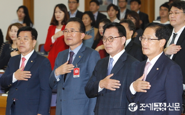 (조세금융신문=전한성 기자) 국회경제정책포럼과 정희수 국회 기획재정위원장이 공동 주최하는 '한국 사회 어디로 가는가? 4대 양극화와 정책대안 - 소득 양극화:소득불평등과 균형성장'이 21일 오후 서울 여의도 국회 의원회관에서 열린 가운데 새누리당 김광림(왼쪽부터) 의원, 한국세무사회 백운찬 회장, 새정치민주연합 박광온 의원, 새정치민주연합 오제세 의원이 국민의례를 하고 있다.