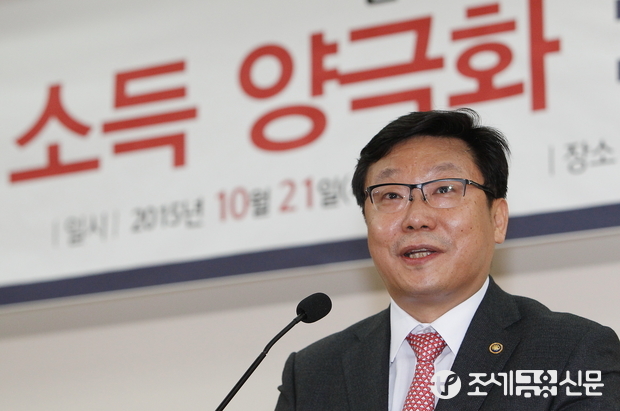 (조세금융신문=전한성 기자) 국회경제정책포럼과 정희수 국회 기획재정위원장이 공동 주최하는 '한국 사회 어디로 가는가? 4대 양극화와 정책대안 - 소득 양극화:소득불평등과 균형성장'이 21일 오후 서울 여의도 국회 의원회관에서 열린 가운데 주형환 기획재정부 제1차관이 축사를 하고 있다.