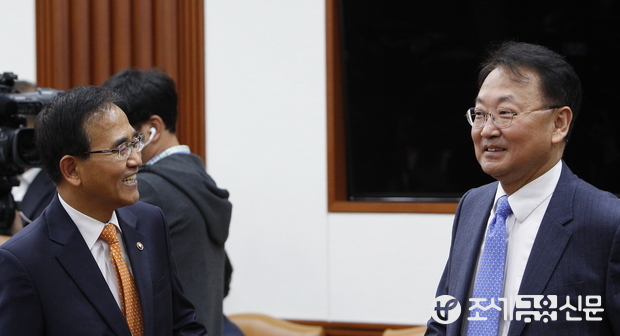 (조세금융신문=전한성 기자) '제176차 대외경제장관회의'가 22일 오후 서울 종로구 세종로 정부서울청사에서 열린 가운데 유일호(오른쪽) 국토교통부 장관과 김낙회 관세청장이 대화 나누고 있다.