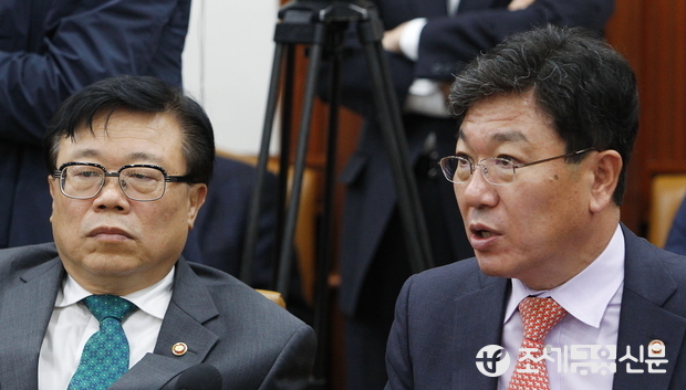 (조세금융신문=전한성 기자) '제176차 대외경제장관회의'가 22일 오후 서울 종로구 세종로 정부서울청사에서 열린 가운데 윤상직(오른쪽) 산업통상자원부 장관과 이동필 농림축산식품부 장관이 대화 나누고 있다.