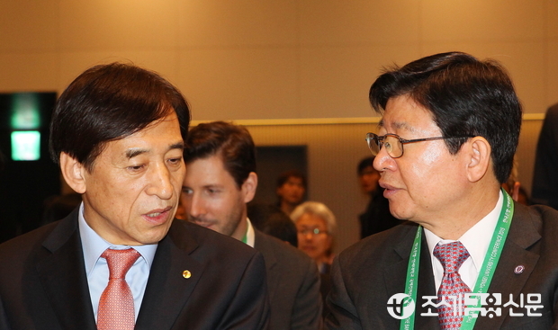 (조세금융신문=전한성 기자) 한국은행 조사국과 연세대학교가 함께 ‘금융안정 평가와 중앙은행에 대한 정책 시사점’을 주제로 한 컨퍼런스를 23일 서울 서대문구 연세대학교 백양누리 그랜드블룸과 대우관에서 개최한 가운데 이주열(왼쪽) 한국은행 총재와 정갑영 연세대학교 총장이 대화 나누고 있다.