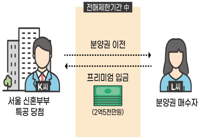 K씨는 신혼부부 특별공급으로 당첨된 아파트 분양권을 전매제한기간 중 프리미엄 2억5000만원을 받고 넘겼다. 계약금 수령 후 전매제한 종료 시점에 소급 계약서를 작성했지만, 불법 전매로 적발됐다.