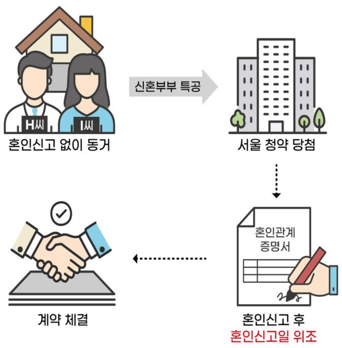 H씨는 신혼특공 부적격 사유를 숨기기 위해 혼인관계증명서의 날짜를 위조해 계약을 체결했다. 또 J씨는 입주자 모집공고일 이후 혼인신고를 한 사실이 들통나자 시행사와 공모해 청약 유형을 '신혼부부'에서 '한부모가족'으로 조작하고 계약했다.
