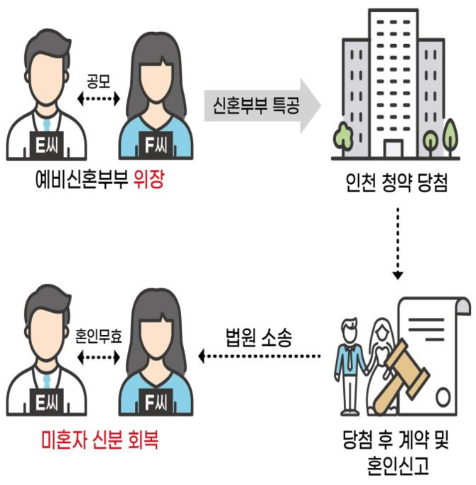 혼인 사실이 전혀 없던 E씨와 F씨는 신혼부부 특별공급 청약을 위해 청약 당첨 이후 혼인신고를 했다. 이후 법원에 '혼인 무효 소송'을 제기해 미혼자 지위를 회복했다. 청약을 위한 형식적 혼인이라는 점이 법원 판결로 드러났다.