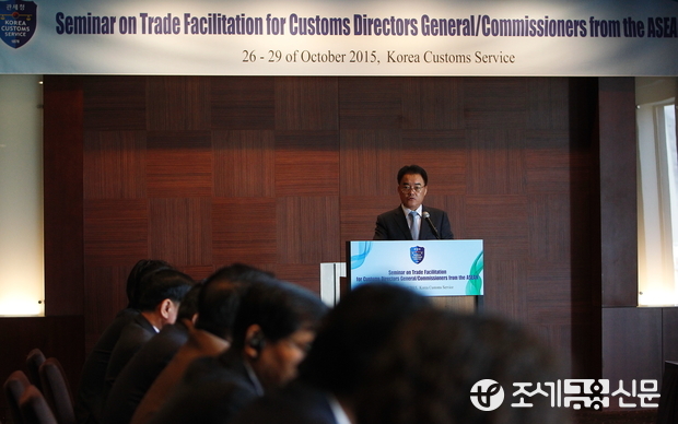 (조세금융신문=전한성 기자) '아세안 고위급 무역원활화 세미나'가 26일 오전 서울 중구 동호로 신라호텔에서 개최된 가운데 관세청 조훈구 정보협력국장이 개회사를 하고 있다.