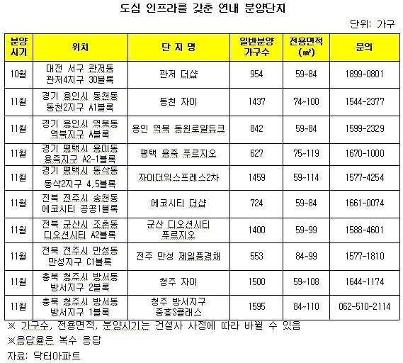 도심 인프라를 갖춘 연내 분양단지로는 포스코건설이 대전 서구 관저4지구 30블록에 짓는 관저 더샵을 10월 분양한다. 전용면적 59~84㎡ 954가구. 관저4지구는 민간택지라 전매제한이 없다.