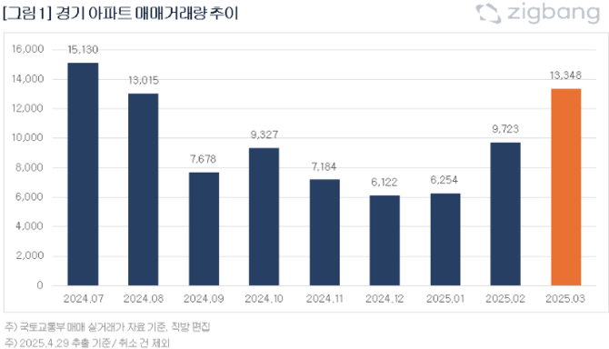 직방이 7일 공개한 국토교통부 실거래가 분석에 따르면, 3월 경기지역 아파트 매매 거래량은 총 1만3348건으로 집계됐다. 이는 전월(9723건) 대비 37% 증가한 수치로, 지난해 8월 이후 7개월 만에 1만 건을 돌파한 것이다. 지난해 12월부터 3개월 연속 증가세도 이어가고 있다.