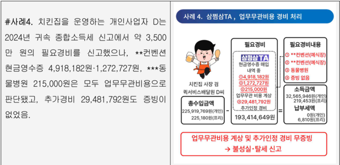 (사례 A) 치킨집을 운영하는 사업자 D는 필요경비로 약 3,500만 원을 신고하였으나, ▲컨벤션 행사 ▲동물병원 이용 등 업무무관 항목이 포함되어 있었고, 약 2,900만 원 상당의 추가경비는 증빙조차 없어