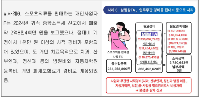(사례 B) 스포츠의류 판매업자 F는 2억 8천만 원의 매출에 대해 ▲치과·산부인과 등 사적 치료비 ▲운전면허학원 등록비 ▲개인 보험료 등을 경비로 계상하여 불성실 신고