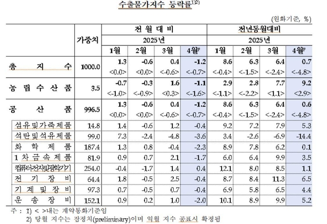 원/달러 평균 환율이 3월 1,456.95원에서 4월 1,444.31원으로 0.9% 낮아진 가운데, 주로 석탄·석유제품(-3.6%)·화학제품(-2.3%)·운송장비(-2.0%) 등이 수출 물가를 끌어내렸다.