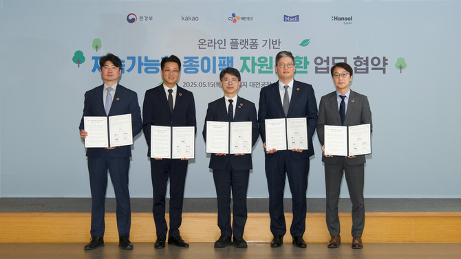 지난 15일 한솔제지 대전공장에서 체결된 이번 협약은 디지털 플랫폼을 활용한 ‘온라인 플랫폼 종이팩 택배회수 시범사업’이다. 매일유업과 카카오가 지난해부터 카카오메이커스를 통해 추진한 ‘멸균팩 새가버치 프로젝트’를 모든 소비자들이 상시 참여할 수 있도록 확대한 형태다.