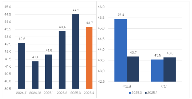 한편 전국적으로는 상승 거래 흐름이 4개월 연속 이어지다가 4월 들어 처음으로 꺾이며, 매수 심리 둔화가 본격화되는 조짐을 보였다. 수도권은 규제 강화, 지방은 실수요 약화 등 지역별 요인이 복합적으로 작용한 것으로 풀이된다.