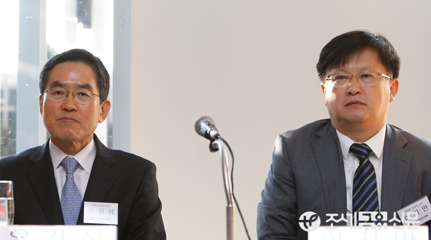 (조세금융신문=전한성 기자) '2015 추계 바른사회공헌포럼 세미나 - 한국의 고용 및 노동정책 방향'이 29일 오전 서울 서초구 JW메리어트 호텔에서 열린 가운데 유길상(왼쪽, 발표) 한국고용정보원장과 이지만(토론) 연세대학교 경영학 교수가 나란히 앉아 있다.