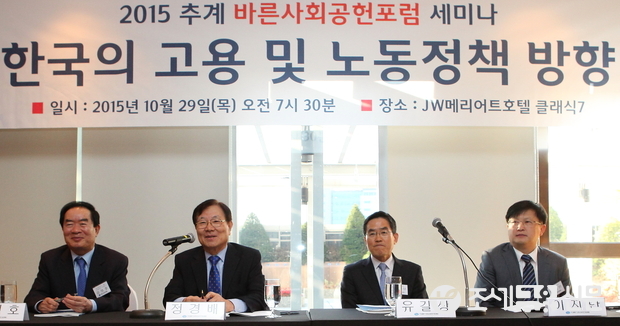 (조세금융신문=전한성 기자) '2015 추계 바른사회공헌포럼 세미나 - 한국의 고용 및 노동정책 방향'이 29일 오전 서울 서초구 JW메리어트 호텔에서 열린 가운데 정경배(왼쪽에서 두번째) 공동대표가 세미나 개최배경을 밝히고 있다.