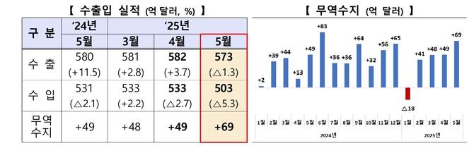 한편, 올해 1~5월 누적 무역수지는 190억달러 흑자를 기록하며 전년 동기 대비 42억달러 증가했다. 무역수지는 올해 들어 5개월 연속 흑자를 이어가고 있다.