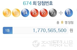 674회 나눔로또 당첨번호 6개를 모두 맞힌 1등 당첨자는 8명으로 각각 17억7056만원씩을 받게 된다.