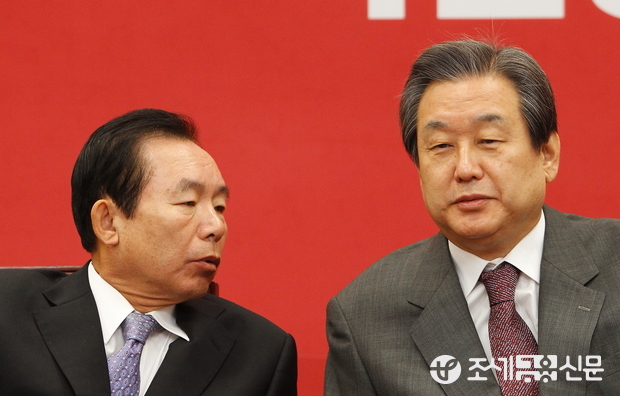 (조세금융신문=전한성 기자) 새누리당 최고위원회의가 2일 오전 서울 여의도 국회 대표최고위원실에서 열린 가운데 김무성(오른쪽) 대표와 이인제 최고위원이 귀엣말을 나누고 있다.