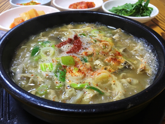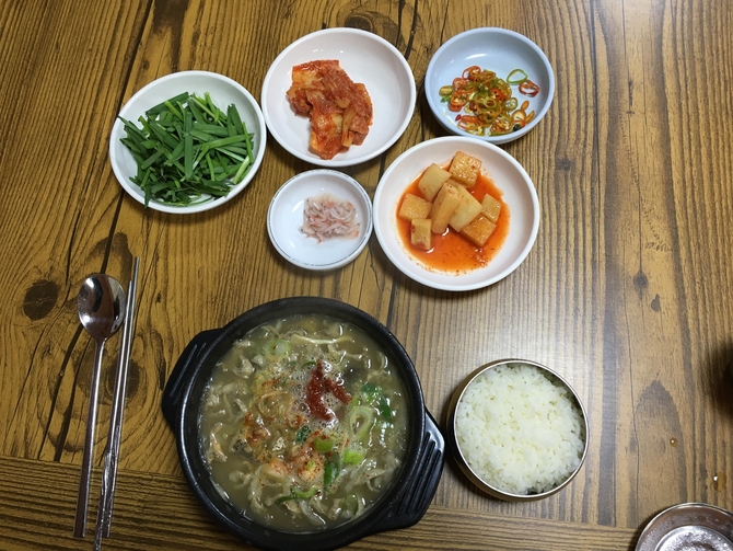 부지런한 이 몇몇은 벌써 대포잔을 기울이고 있었고, 주방에선 고기 손질하는 소리와 연기가 바쁘게 어우러진다. 국물 한 수저로 간밤의 숙취를 풀어낸다. 뼈를 우린 뽀얀 국물은 해장뿐 아니라 허기까지 달래준다. 콜라겐과 단백질이 듬뿍 들어 있어 몸에도 이롭다.