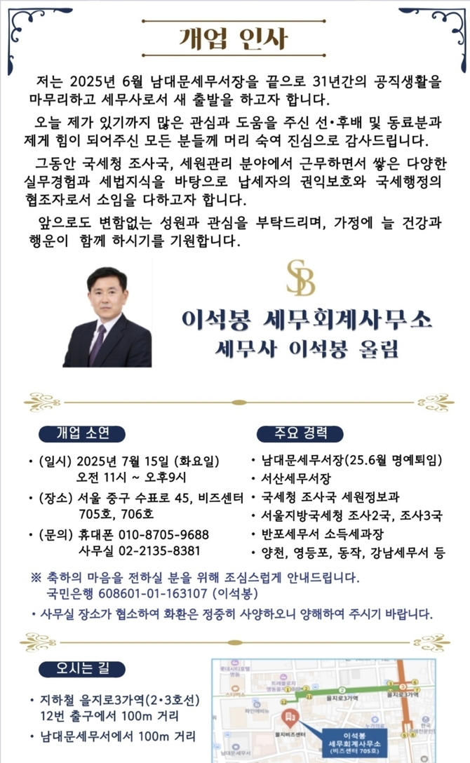 사무실 오픈은 오는 7월15일 서울 중구 수표로 45 비즈센터에서 국세청 안팎의 선⬝후배와 동료, 지인을 모시고 개업소연을 갖는다.