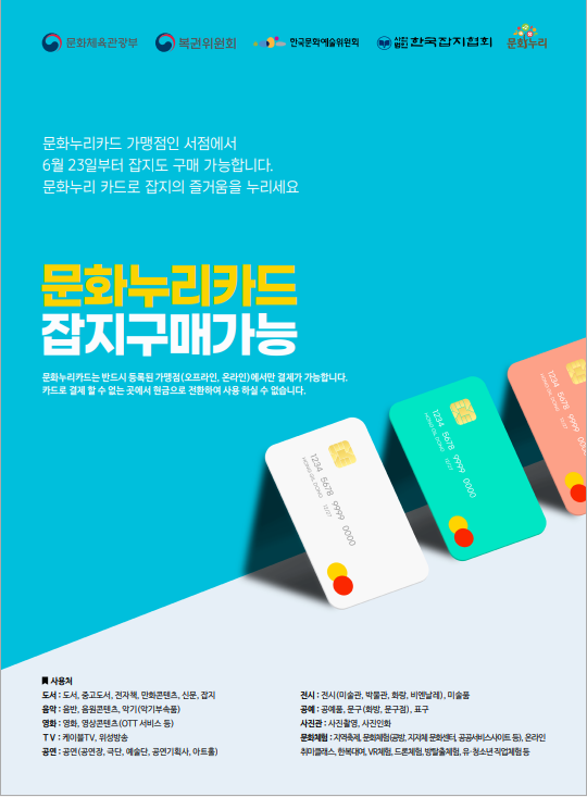 이번에 정부가 지원하는 문화바우처 사업 중 하나인 문화누리카드의 사용 허용 품목에 잡지가 새롭게 포함됨으로써 독자들의 문화 향유 기회가 더욱 확대될 것으로 보인다.