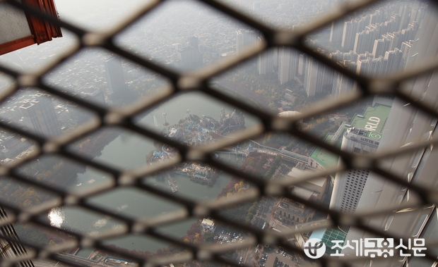 (조세금융신문=전한성 기자) 롯데면세점 월드타워점 프레스투어가 4일 오전 서울 송파구 롯데시네마 월드타워점에서 열린 가운데 롯데월드타워 70층에서 내려다 본 롯데월드의 모습이 아기자기하게 보인다.