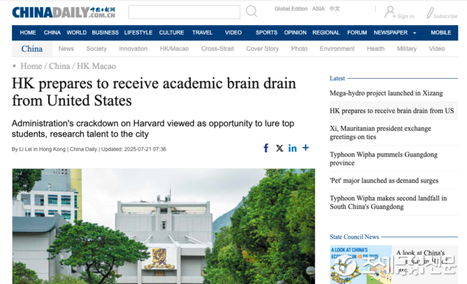 트럼프 미국 대통령이 중국계 및 아랍, 기타 유색인종 학생들과 학자들을 하버드 등 최고의 미국 대학에 진학할 수 없도록 규제, 세계 수준의 영어 교육을 제공하면서 중국 본토의 급성장하는 혁신 생태계와 긴밀한 통합을 보장하는 홍콩의 대학들이 주목받고 있다는 보도다.