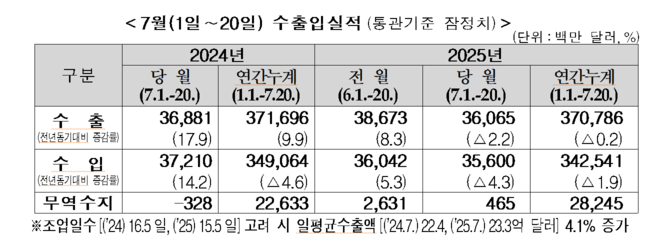21일 관세청은 1일부터 20일까지 수출입현황을 발표하고, 수출은 361억달러로 전년동기대비 2.2%감소, 수입은 356억달러로 전년동기대비 4.3% 감소했다고 밝혔다.