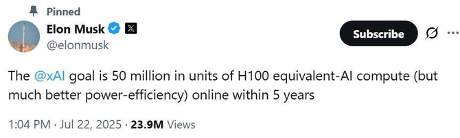 22일(현지시간) 연합뉴스에 따르면 머스크는 이날 엑스(X·옛 트위터)에 "xAI의 목표는 5년 안에 H100급에 해당하는 AI 연산 유닛 5천만 개 규모를 온라인으로 가동하는 것"이라며 "하지만 전력 효율은 훨씬 더 나을 것"이라고 썼다.