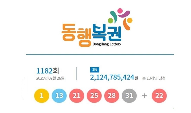 (조세금융신문=김종태 기자) 제1182회 로또복권 추첨에서 '1, 13, 21, 25, 28, 31'이 1등 당첨번호로 뽑혔다. 2등 보너스 번호는 '22'이다.