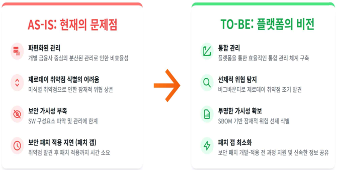 이는 IT 침해사고의 최초 진입점 또는 피해 확산점인 SW 취약점을 통해 관리하고 정보를 공유함으로써, 사이버 위협에 선제적으로 대응 및 금융권 자율 보안 역량 강화가 목표다.