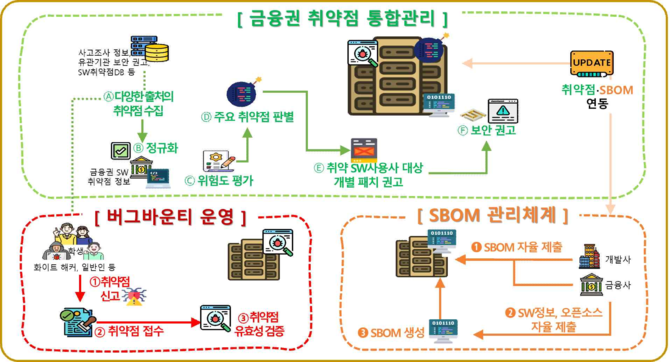SBOM 관리체계는 금융사가 사용하거나 금융소비자에게 배포하는 SW에 대한 SBOM 관리체계를 마련해, 새로운 취약점 발견 시 금융권 영향을 신속하게 분석‧대응할 수 있도록 지원한다.