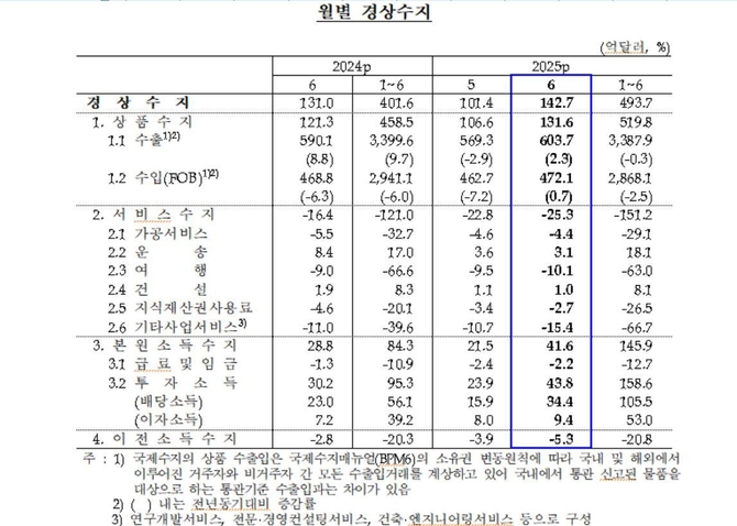 한국은행이 7일 발표한 국제수지 잠정 통계에 따르면 6월 경상수지는 142억7천만달러(약 19조7천700억원) 흑자로 집계됐다.