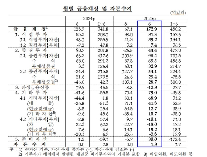 금융계정 순자산(자산-부채)은 6월 중 172억9천만달러 불었다. 직접투자는 내국인의 해외투자가 39억2천만달러, 외국인의 국내 투자가 7억4천만달러 각각 늘었다.