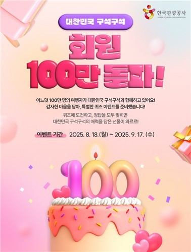 (조세금융신문=최주현 기자) 한국관광공사는 18일 국내여행 정보 통합 플랫폼 '대한민국 구석구석' 회원 수가 지난달 31일 기준으로 100만명을 돌파했다고 밝혔다.