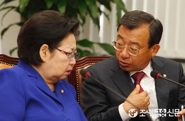 (조세금융신문=전한성 기자) 새누리당 최고위원회의가 9일 오전 서울 여의도 국회 대표최고위원실에서 열린 가운데 김을동(왼쪽) 최고위원과 이정현 최고위원이 대화 나누고 있다.
