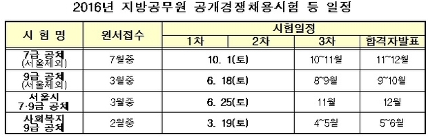 서울시를 제외한 16개 시도에서 일제히 실시하는 9급 공채시험은 내년 6월 18일, 7급 공채시험은 내년 10월 1일에 실시한다. 다만, 서울시는 내년 6월 25일에 7·9급 시험을 동시에 실시할 예정이다.