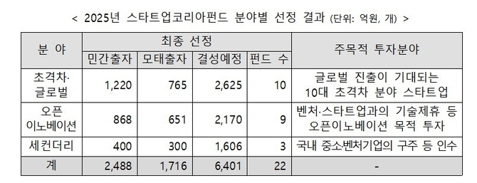 올해는 27개 민간 출자자가 2천488억원을, 모태펀드가 1천716억원을 출자해 총 6천401억원 규모로 결성한다.