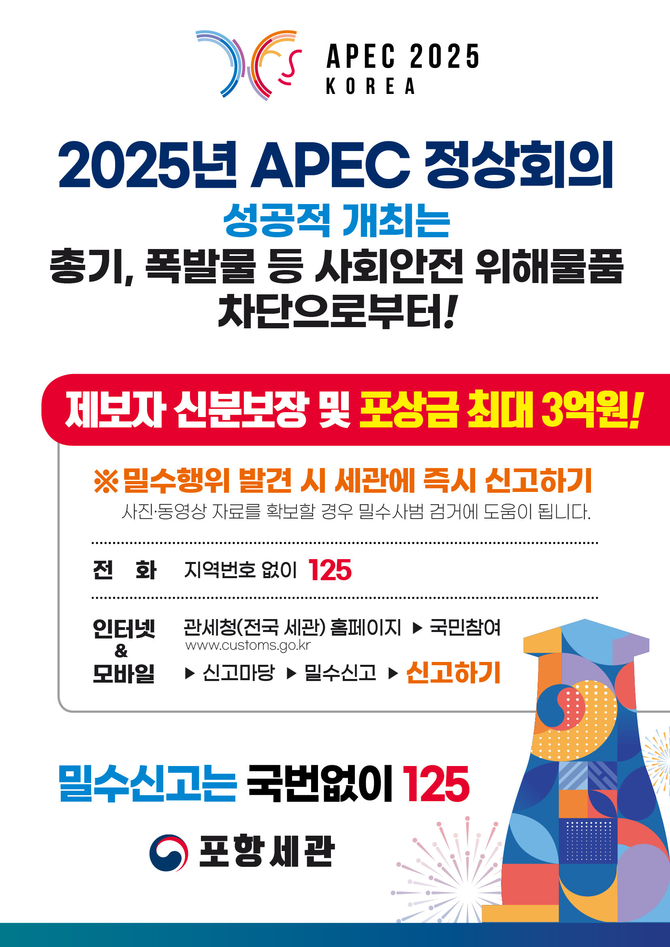 (조세금융신문=안종명 기자) 포항세관(세관장 김재철)이 APEC 정상회의의 성공적 개최를 지원하기 위해 사회안전 위해물품 밀수 근절 캠페인을 진행했다. 시민들의 자발적인 신고 문화를 확산시키고 안전한 교역 환경을 조성하기 위함이다.