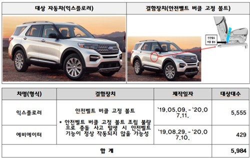 포드 익스플로러 등 2개 차종 5천984대는 안전벨트 버클 고정 볼트 조립 불량이 발견돼 지난 5일부터 시정조치를 진행하고 있다.