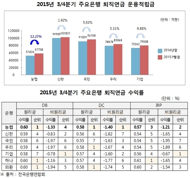 (조세금융신문=김사선 기자) NH농협은행은 ‘15년 9월말 기준으로 시중은행 가운데 퇴직연금 운용적립금 성장률과 DC, DB 적립금 운용수익률 부문에서 1위를 기록했다고 밝혔다.