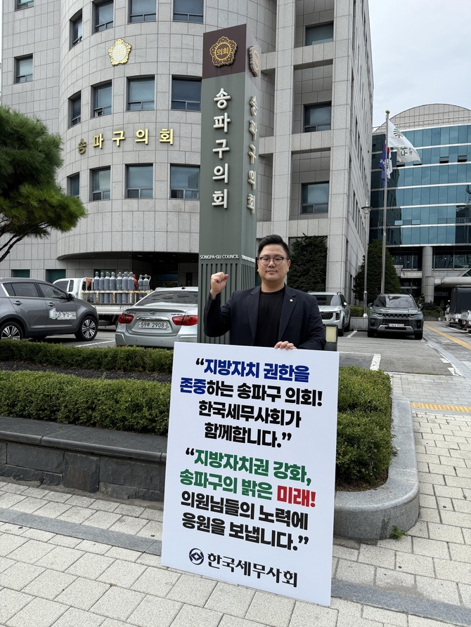 (조세금융신문=안종명 기자) 서울 송파구의회 앞에서 이색적인 응원전이 펼쳐졌다. 주인공은 바로 청년세무사들이다. 이들은 단순한 집회 형식을 넘어 ‘1인 릴레이 응원’이라는 새로운 방식으로 지방자치를 응원하며 긍정적인 사회 참여 문화를 확산하고 있다.