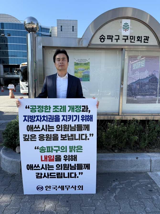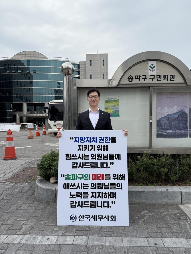 청년세무사위원회 소속 위원들은 지난 9일부터 송파구의회 앞에서 "지역과 시민을 위한 의정활동을 응원합니다", "투명하고 공정한 지방자치를 지지합니다"라는 메시지를 들고 릴레이 응원 활동을 전개했다.