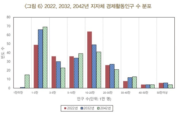 보고서는 앞으로 시군구 간 경제활동인구 양극화가 심화할 것으로 내다봤다. 예컨대 경제활동인구 1만명 미만 시군구는 현재 0곳에서 2042년 15곳으로, 30만명 이상인 시군구는 18곳에서 21곳으로 각각 늘어날 것으로 예상했다.