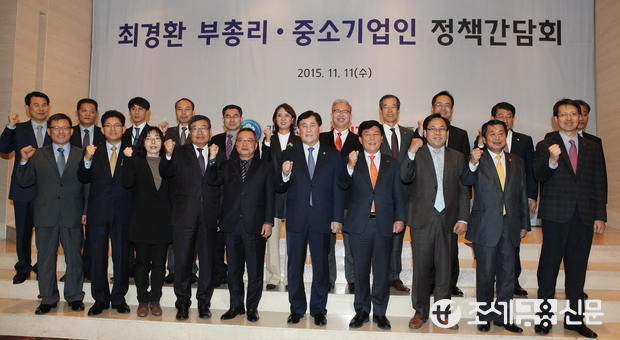 (조세금융신문=전한성 기자) 최경환(앞줄 오른쪽 다섯번째) 경제부총리 겸 기획재정부장관이 11일 오후 서울 여의도 중소기업중앙회를 찾아 중소·벤처기업인 대표들과 간담회를 갖은 가운데 내빈들과 기념촬영을 하고 있다.