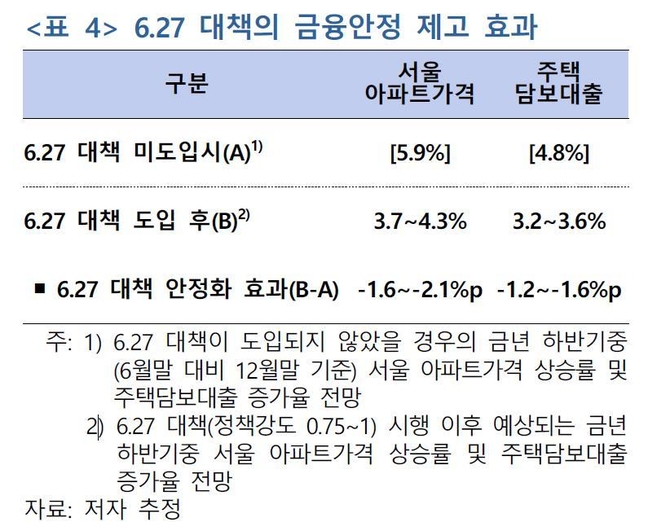 구체적으로 6·27 규제가 없었다면 올해 하반기(6월 말 대비 12월 말 기준) 서울 아파트 가격은 약 6% 오르고 주택담보대출도 약 5% 증가할 것으로 예상됐지만, 6·27 규제 도입에 따라 상승률과 증가율이 각 1.6∼2.1%포인트(p), 1.2∼1.6%p 떨어질 것으로 추정된다는 설명이다.