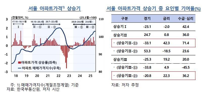 최근(2024년 6월∼2025년 8월) 서울 아파트 가격의 요인별 기여율 분석에서는 경기 부진이 20.8%의 하방 압력으로 작용했지만, 수급·심리와 금리 인하가 36.2%, 22.3%씩 가격 상승에 영향을 미친 것으로 분석됐다.