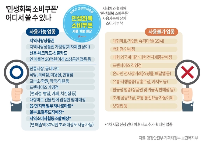군 장병의 경우 이번 2차 지급분부터 복무지 인근 상권에서도 쿠폰 사용이 가능해졌다. 또 지역 생활협동조합 매장 가운데 연 매출 30억원을 초과하는 곳도 공익적 목적을 고려해 사용처로 추가된다.