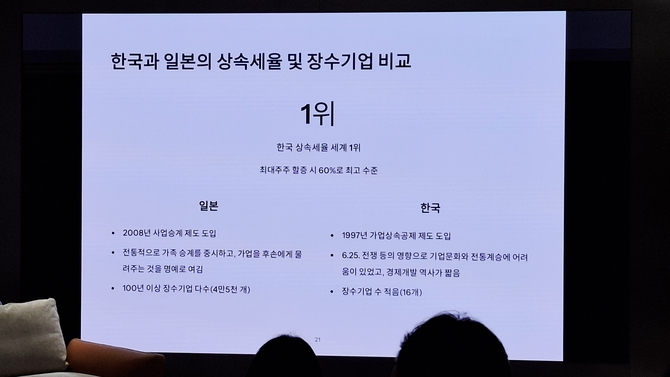 황정길 세무사는 “한국과 일본의 상속세율 및 장수기업 비교에 따르면 한국 상속세율 1위, 최대주주 할증시 60%로 최고 수준”이라고 밝혀, ‘제도 현실화’가 시급한 것으로 분석됐다.