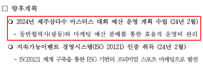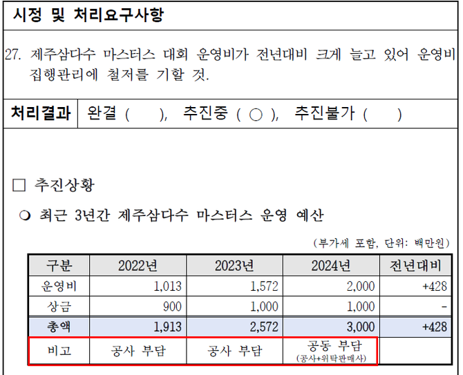 제주도의회는 “운영비가 전년 대비 크게 늘고 있다”며 관리 대책을 주문했다. 제주개발공사는 “광동제약과 마케팅 예산을 분배해 효율적으로 관리하겠다”고 보고했다. 이는 골프대회의 마케팅 비용 등을 광동제약과 나누어 부담하는 구조로, 급증한 운영비에 대한 예산 압박을 줄이려는 조치다.