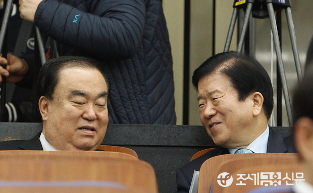 (조세금융신문=전한성 기자) '새정치민주연합 정책의원총회'가 12일 오전 서울 여의도 국회에서 열린 가운데 문희상(왼쪽) 전 비상대책위원장과 박병석 의원이 대화 나누고 있다.